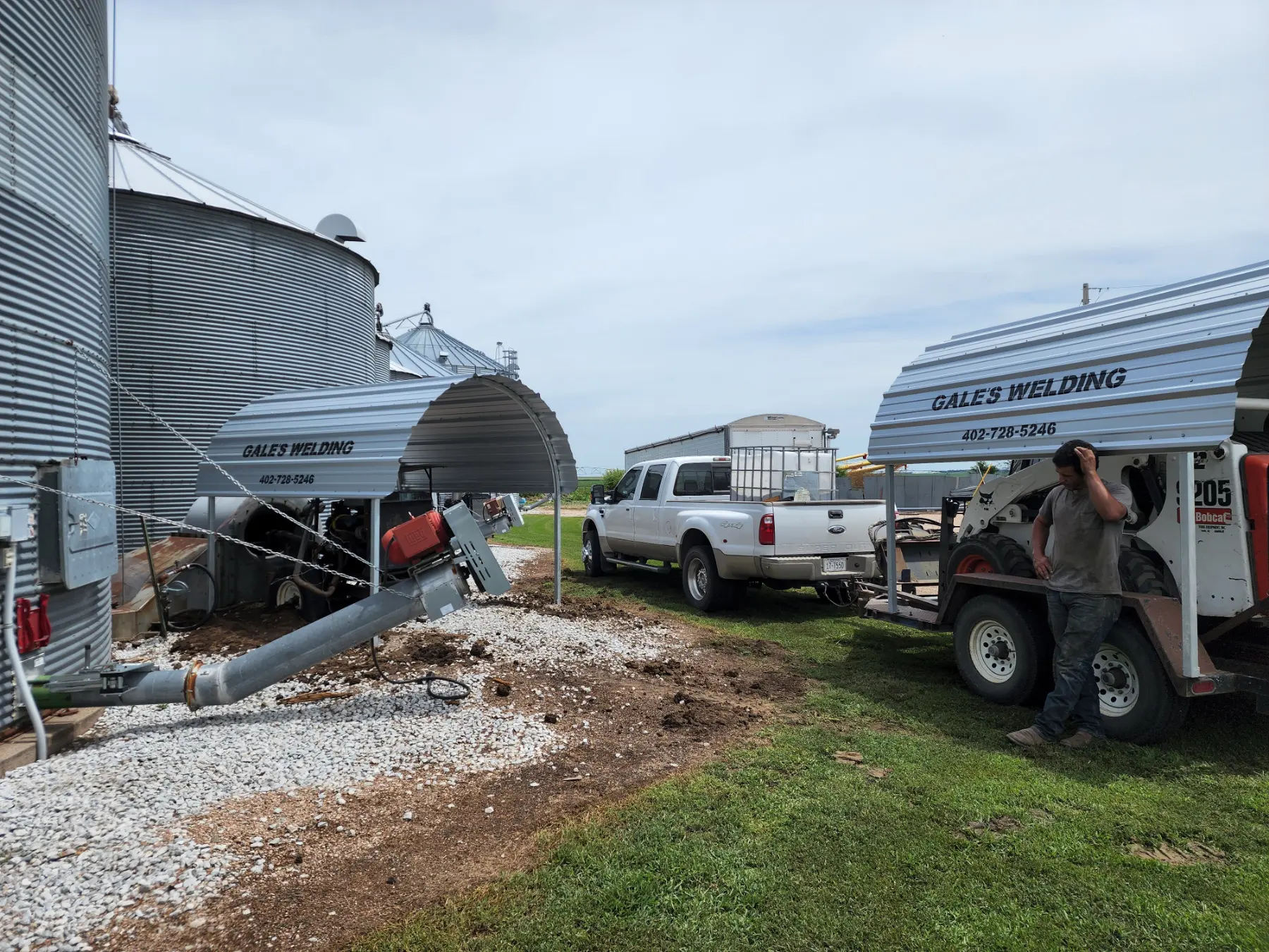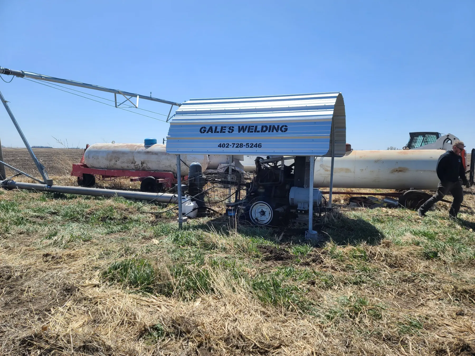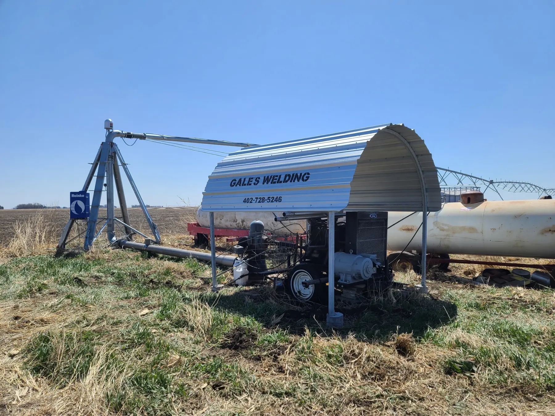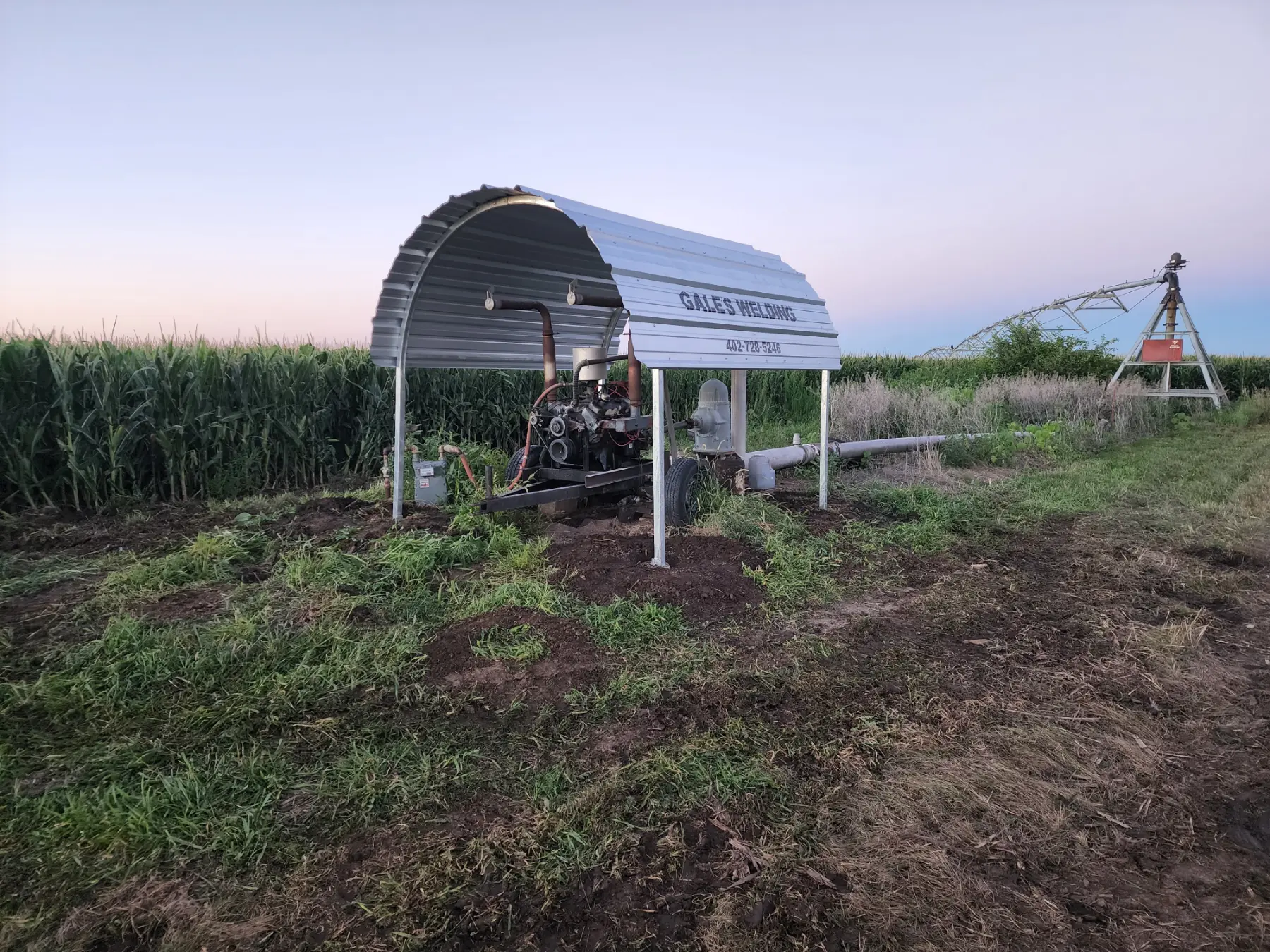 Irrigation Motor Sheds, they are what we are known for and probably what we do best! Which is saying something, considering all the things we do well. Our years and years of experience fabricating and installing the sheds puts us close to perfection. Whether they are installed on a concrete pad in your field or using our precast concrete anchors. The galvanized frame with galvanized tin, proudly displaying Gales Welding, will provide a clean finished look, and most importantly protect your engine and other equipment from the weather.